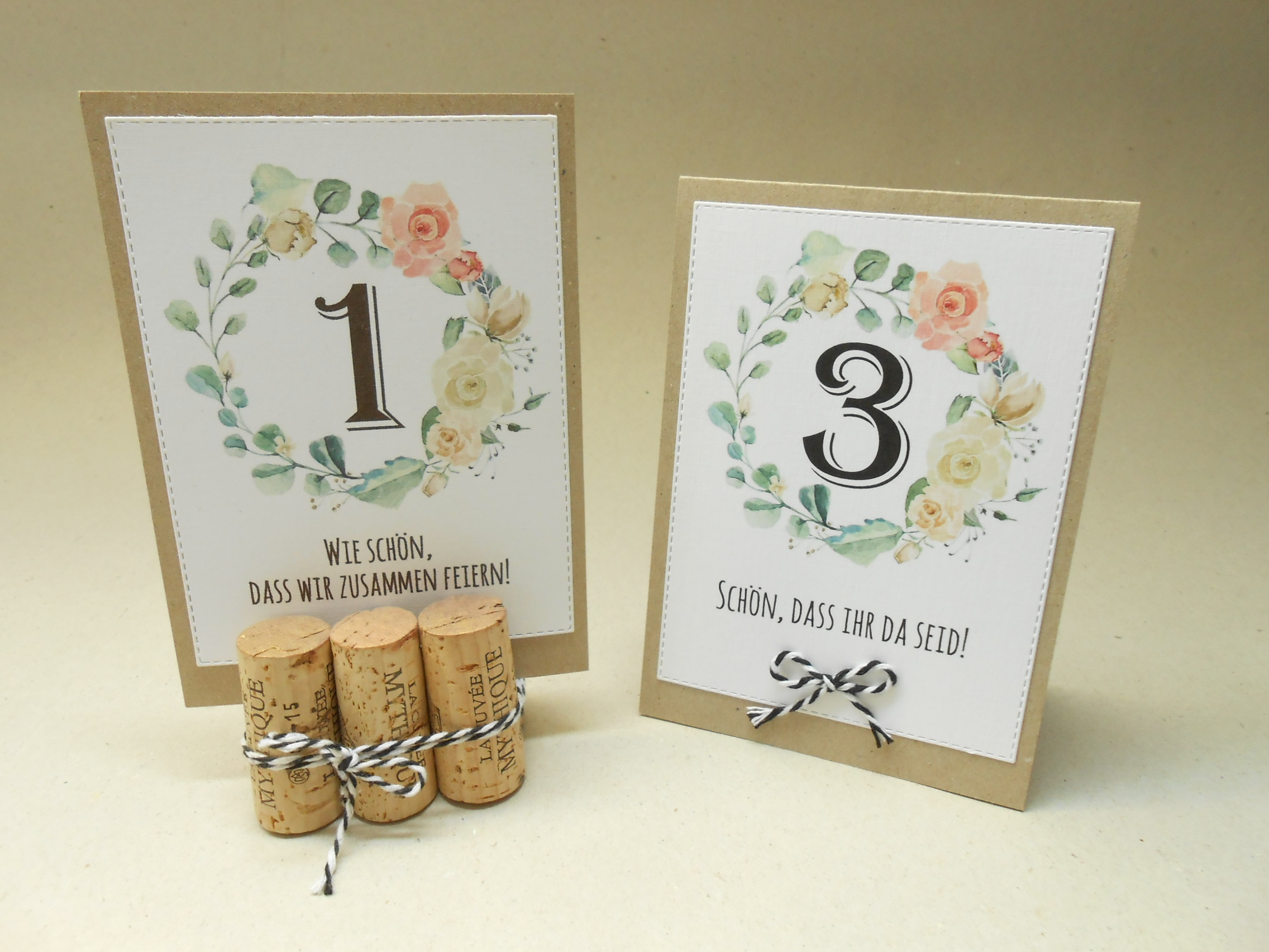 Die Tischnummer kann man als einzelne Karte auf dem Tisch dekorieren, sie auf der Menükarte unterbringen oder zusammen mit den Gastnamen am Tisch platzieren.